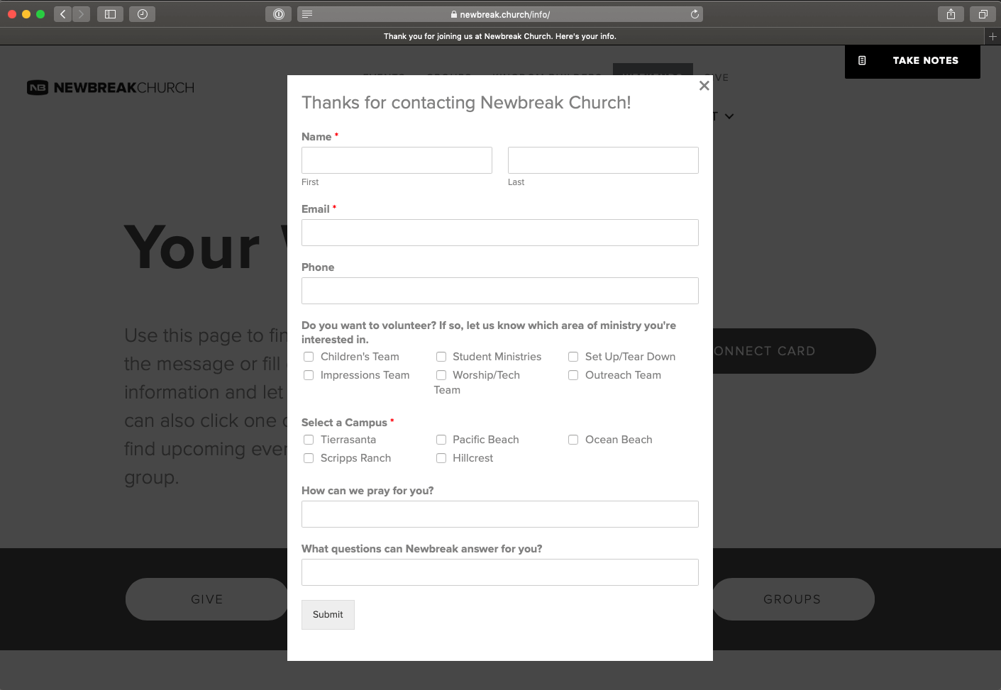 Newbreak Church has taken this to a whole new level. As their guests walk through any one of their five campuses, they platform their Weekend Info webpage. This /info page highlights: