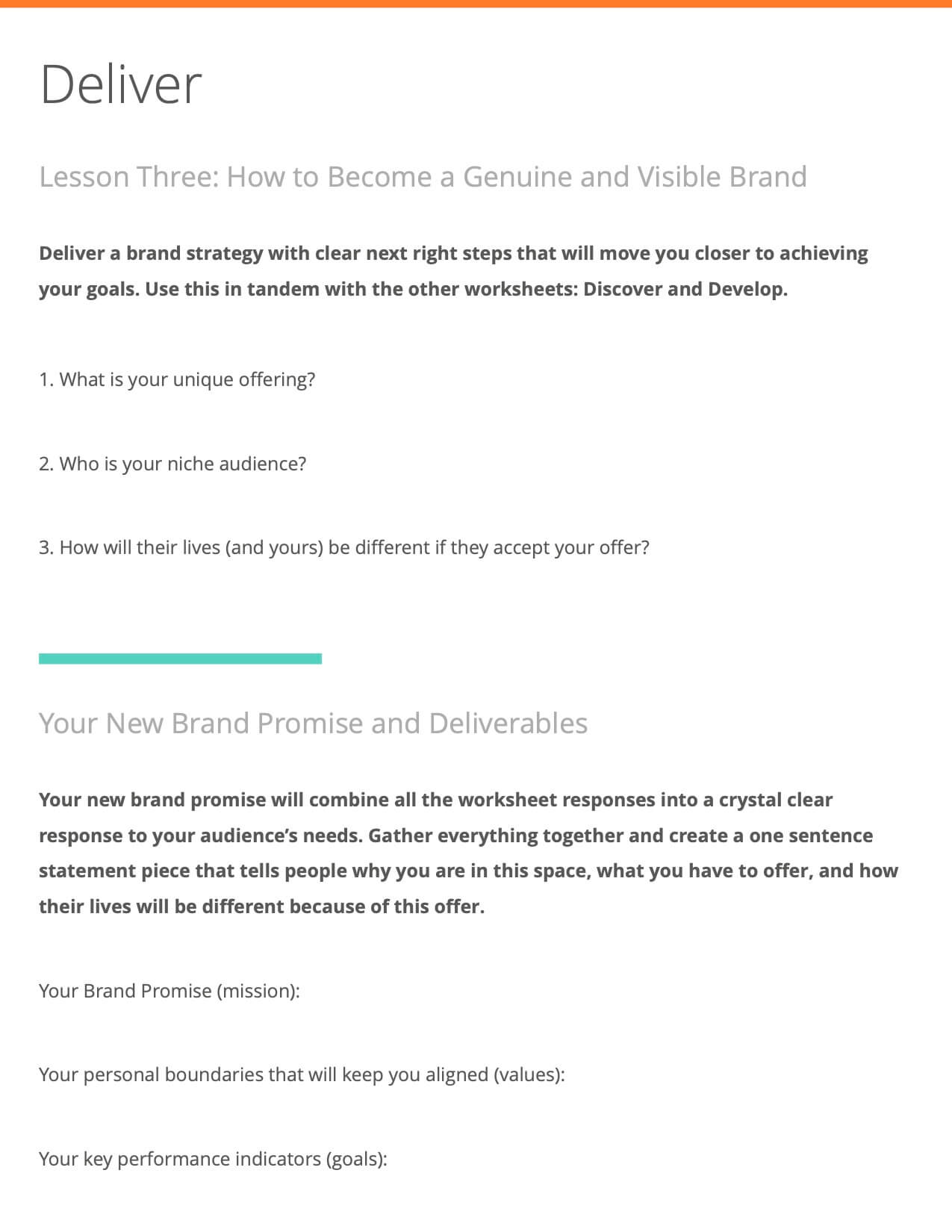 Once you have completed all three lessons and their corresponding worksheets, you will have a workable brand that you can begin to take out into the world, to your audience, on their terms.